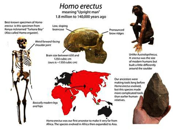 ഹോമോ ഇറക്റ്റസ് നിവർന്നുനടക്കുന്ന ഇടത്തരം ഉയരമുള്ള ഒരു മനുഷ്യനായിരുന്നു. ആഫ്രിക്കയിൽ നിന്ന് പശ്ചിമേഷ്യയിലെത്തിയ ഹോമോ ഹാബിലിസ് അവിടെ ആദ്യകാല ഹോമോ ഇറക്റ്റസ് ആയി വികസിച്ചുവെന്നും, ആദ്യകാലഹോമോ ഇറക്റ്റസ് പിന്നീട് പശ്ചിമേഷ്യയിൽ നിന്ന് കിഴക്കൻ ഏഷ്യയിലേക്ക് (Peking Man), തെക്കുകിഴക്കൻ ഏഷ്യയിലേക്ക് (Java) ചിതറിപ്പോയെന്നും കരുതുന്നു. മറ്റൊരു വിഭാഗം ആഫ്രിക്കയിലേക്കും (ഹോമോ എർഗാസ്റ്റർ) മറ്റൊരു വിഭാഗം യൂറോപ്പിലേക്കും (ടൗട്ടാവെൽ മാൻ) എത്തപ്പെട്ടു. ഒടുവിൽ ആഫ്രിക്കയിൽ ആധുനിക മനുഷ്യരായി പരിണമിച്ചു എന്ന് കരുപ്പെടുന്നു
