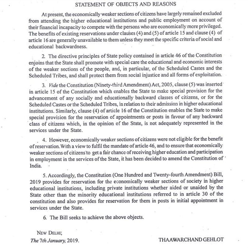 മുന്നാക്കവിഭാഗങ്ങൾക്ക് 10 ശതമാനം സാമ്പത്തികസംവരണം ഉറപ്പാക്കുന്ന 10 ശതമാനം സാമ്പത്തികസംവരണം ഉറപ്പാക്കുന്ന 124ാംമത് ഭരണഘടനാഭേദഗതി ബില്ല് കേന്ദ്രസർക്കാർ ലോക്സഭയിൽ പാസ്സാക്കി. 3 നെതിരെ 323 പേർ വോട്ടു ചെയ്താണ് ലോകസഭയില് ബില് പാസായത്. 323 പേര് ബില്ലിനെ അനുലിച്ചപ്പോൾ മുസ്ലിം ലീഗിന്റെ പികെ കുഞ്ഞാലിക്കുട്ടിയും ഇടി മുഹമ്മദ് ബഷീറും എംഐഎം അദ്ധ്യക്ഷൻ അസദുദ്ദീൻ ഒവൈസിയും മാത്രമാണ് ബില്ലിനെ എതിർത്ത് വോട്ടു ചെയ്തത്. ബില് ഇന്ന് രാജ്യസഭയി കൊണ്ടുവരും അതിനായി ഇന്ന് അവസാനിക്കേണ്ട രാജ്യസഭ ശീതകാല സമ്മേളനം നാളെ കൂടി ചേരാനാണ് ധാരണ.
